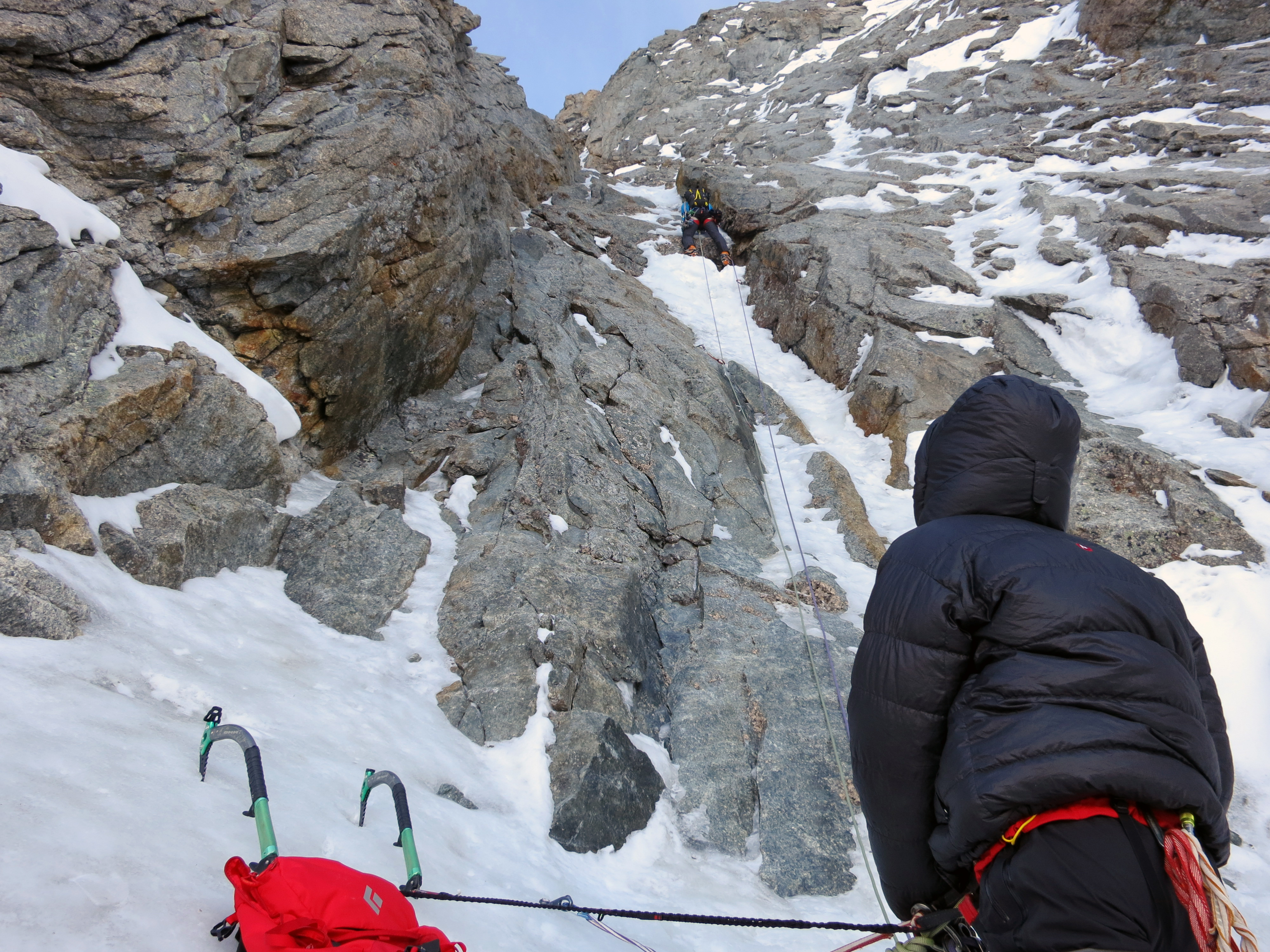 Arriving at the bottom of the first difficulties we switched from moving together to pitching and Andy took the lead. On the thin ice pitch of pitch 2 Andy sent down a few chunks of the fragile ice, one of which hit me square in the chest and properly knocked the wind out of me. The combination of a soggy, cold foot, sore ribs and a general feeling of lassitude that seemed hard to shake I (and Jack) resigned to the fact that Andy would do a much better job of leading the harder pitches. A true WAD shows he still has it only 24 hours after arriving in chamonix, unacctlimatised and having not mixed climbed in a while. A inspiring effort. Although the climbing was never super hard it required care and was sometimes pretty thin.