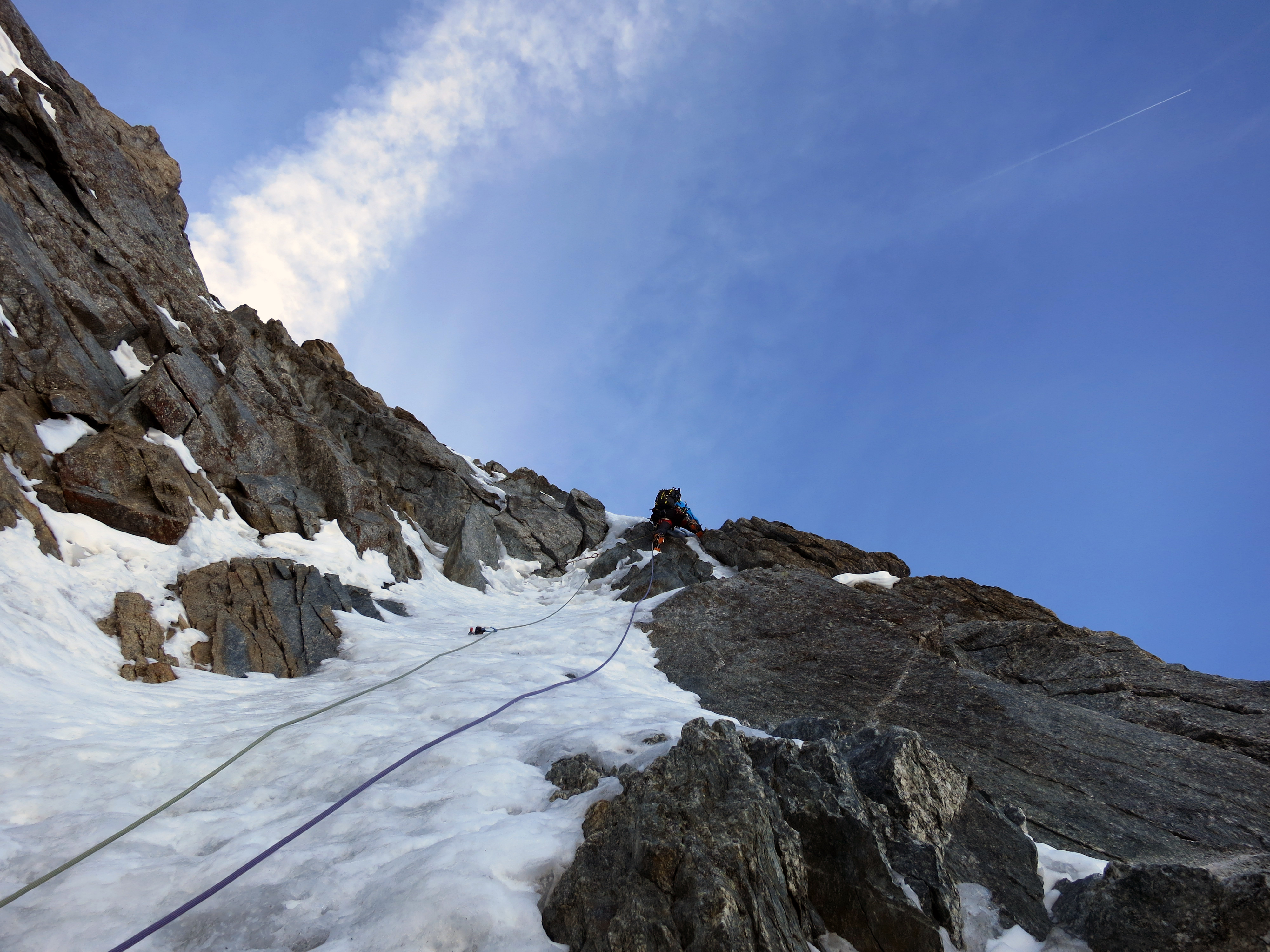 Arriving at the bottom of the first difficulties we switched from moving together to pitching and Andy took the lead. On the thin ice pitch of pitch 2 Andy sent down a few chunks of the fragile ice, one of which hit me square in the chest and properly knocked the wind out of me. The combination of a soggy, cold foot, sore ribs and a general feeling of lassitude that seemed hard to shake I (and Jack) resigned to the fact that Andy would do a much better job of leading the harder pitches. A true WAD shows he still has it only 24 hours after arriving in chamonix, unacctlimatised and having not mixed climbed in a while. A inspiring effort. Although the climbing was never super hard it required care and was sometimes pretty thin.